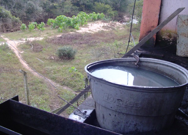 Imagem: Caixa d’água sem tampa de proteção, com água visivelmente suja e inadequada para consumo. Fonte: Airton Noé Araujo da Silveira.