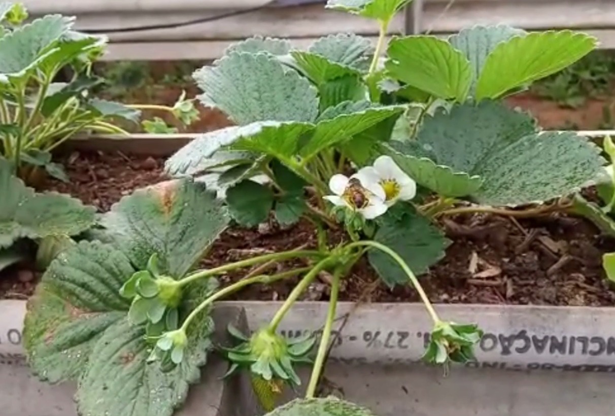 Na ausência de agrotóxicos, é possível visualizar abelhas e outros insetos voadores, que se alimentam na flores e auxiliam na polinização natural, aumentando a produtividade da produção. Imagem: Abelha em interior de flor de morango. Fonte: Airton Noé Araujo da Silveira.
