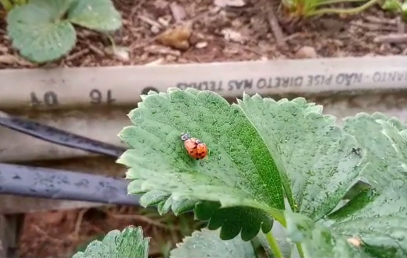 As joaninhas são insetos de coloração avermelhada, e possuem um aspecto importantíssimo na manutenção do equilíbrio de diversas outras espécies de insetos, já que são predadores naturais , como por exemplo de pulgões, que são prejudiciais a diversos tipos de hortaliças. Onde não há agrotóxico, é possível que as joaninhas se instalem e colaborem de forma natural no controle de outras espécies consideradas pragas para a agricultura. Imagem: Joaninhas em plantação de morangos. Fonte: Airton Noé Araujo da Silveira.