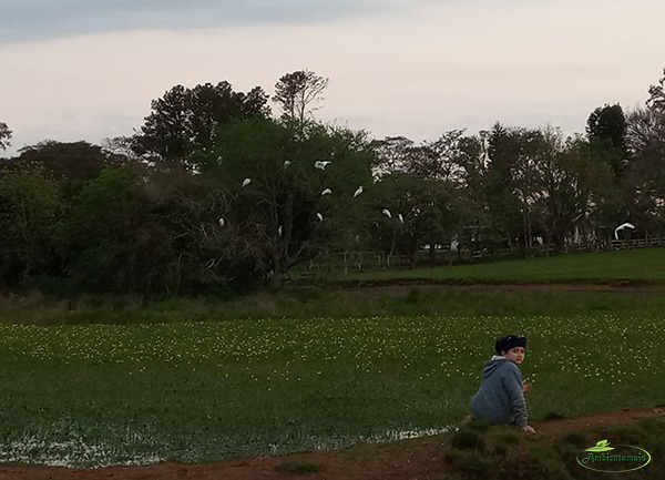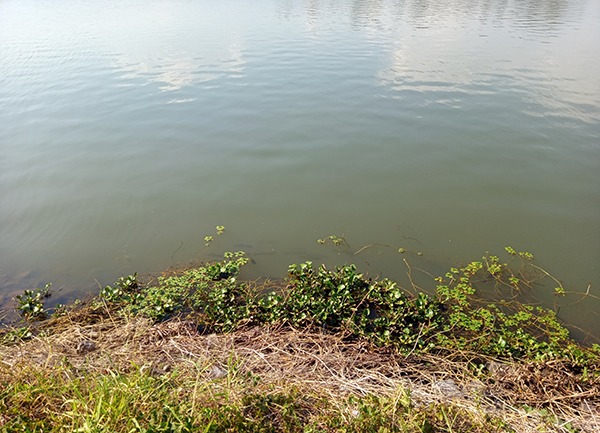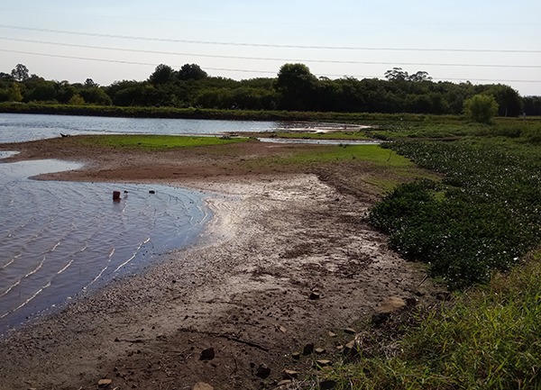 Imagem: Aglomeração de aguapés, em borda de lago, na direita da imagem. Santa Cruz do Sul – RS. Fonte: Airton Noé Araujo da Silveira.