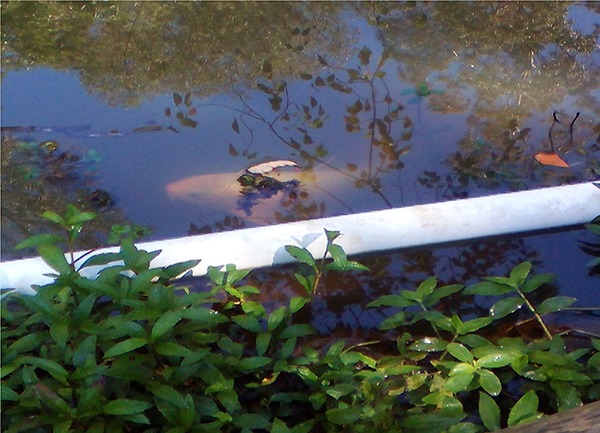Imagem: Carpa em borda de açude onde há plantas aquáticas para se alimentar. Novo Cabrais – RS. Fonte: Airton Noé Araujo da Silveira.
