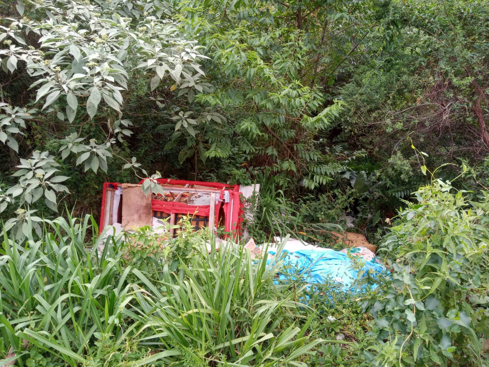 Resíduos descartados de forma irregular na margem de um pequeno córrego, próximo a RSC 453, no “Trecho A” . Fonte: Airton Noé Araujo da Silveira.