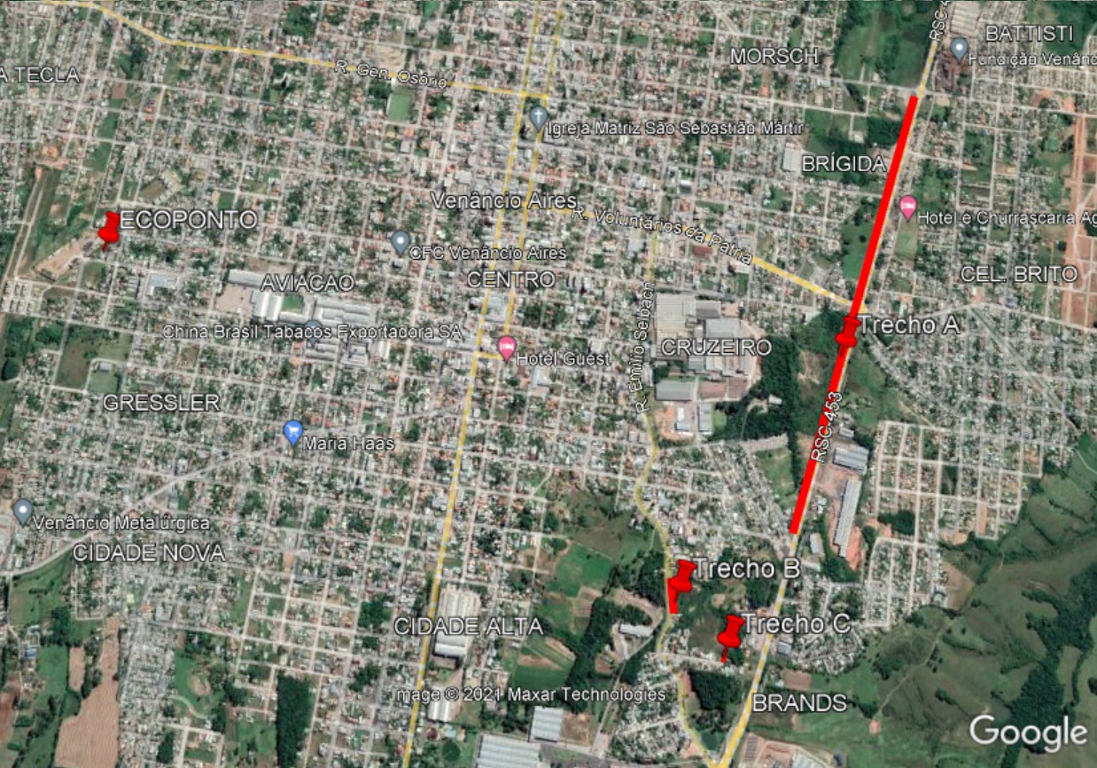 Observando alguns trechos da cidade, como nas proximidades da RSC 453, temos uma triste realidade, e que é relevante abordar como nas imagens a seguir, para uma breve reflexão. Fonte: Google Earth Pro
